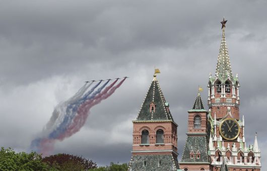 [모스크바=신화/뉴시스] 러시아 곡예비행단이 6일(현지 시간) 러시아 모스크바 붉은광장에서 제80주년 2차 세계대전 승리 기념 '전승절' 열병식 예행연습을 하면서 러시아 국기 색깔 연막을 뿌리고 편대 비행을 하고 있다. 2025.05.07. |