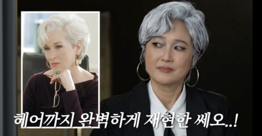 이날 도전한 캐릭터는 영화 ‘악마는 프라다를 입는다’ 속 미란다 프리슬리. 송은이는 은빛 머리와 날렵한 콧날, 절제된 표정까지 소화하며 완벽한 변신을 예고했다.