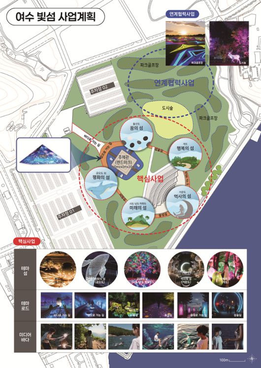 세부적으로는 △여수를 대표하는 섬을 영상조명으로 표현한 '테마 섬' △섬별 특색을 연출한 테마 로드 '여수 빛섬길' △프로젝션 맵핑, 몰입형 영상, 인터렉티브 체험시설 등 디지털 기술을 활용한 참여형 콘텐츠 '미디어바다' 등이 있다.