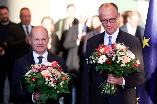 독일 신구 총리6일(현지시간) 독일 베를린 총리 관저에서 열린 총리 이임식에서 프리드리히 메르츠 신임 총리(오른쪽)와 올라프 숄츠 전 총리(왼쪽)가 꽃다발을 들고 기념촬영을 하고 있다. EPA연합뉴스 |