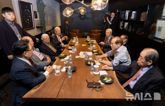 [서울=뉴시스] 황준선 기자 = 7일 오후 서울 시내 한 호텔에서 국민의힘 상임고문단이 황우여 국민의힘 공동선거대책위원장과의 긴급 회동에 앞서 대화를 하고 있다. 왼쪽부터 유준상, 김종하, 목요상, 유흥수, 나오연, 신영균, 신경식, 김동욱 상임고문. 2025.05.07. hwang@newsis.com |