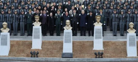 2018년 3월1일 서울 육군사관학교에서 열린 독립전쟁 영웅 5인(홍범도·이회영·지청천·이범석·김좌진) 흉상 제막식에서 신흥무관학교를 세운 이회영 선생의 손자인 이종찬 광복회장, 이종걸 전 더불어민주당 의원, 청산리대첩을 이끈 김좌진 장군의 손녀인 김을동 전 새누리당 의원과 육사 생도 등이 참석하고 있다. 연합뉴스 |
