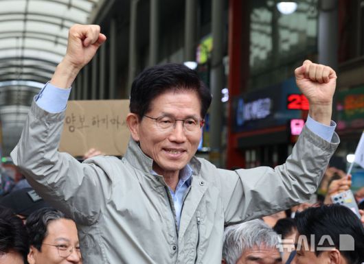 [포항=뉴시스] 권창회 기자 = 김문수 국민의힘 대선 후보가 6일 경북 포항시 죽도시장을 방문해 시민들에게 인사하고 있다. 2025.05.06. kch0523@newsis.com |