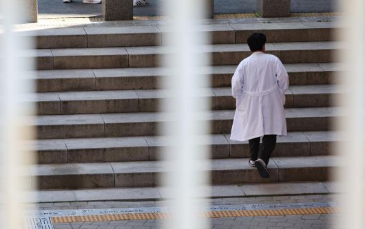 교육부와 각 의대가 제시한 미복귀 의대생에 대한 유급·제적 처분 확정일인 7일 서울 시내 한 의과대학에서 의료진이 이동하고 있다. 수업 참여 의사를 밝히지 않은 의대생들의 유급이 확정될 시 내년 학기에는 24·25·26학번이 동시에 1학년 수업을 듣는 ‘트리플링’(tripling) 사태가 벌어지고 의대 1학년 학생만 1만 명이 넘어 의대 교육에 차질이 생길 전망이다. 뉴시스 |