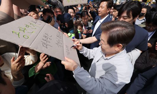 공판 연기 축하 팻말 받는 李 더불어민주당 이재명 대선 후보가 7일 전북 전주시 풍남문 앞 광장에서 지지자들에게 인사하다가 한 지지자가 든 파기환송심 공판 연기 축하 팻말에 사인하고 있다. 이날 서울고등법원은 15일로 예정됐던 이 후보의 공직선거법 위반 혐의 사건 파기환송심 첫 공판을 대선 뒤인 다음달 18일로 연기했다. 연합뉴스 |