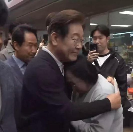 지난 4일 이재명 더불어민주당 대통령 선거 후보가 고 양회동 열사 아내인 김선희 씨를 유세 도중에 위로했다. [사진=이재명 팬채널 명블리 방송화면 갈무리] |