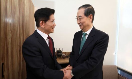 국민의힘 김문수 대선후보(왼쪽)와 무소속 한덕수 대선 예비후보가 7일 서울 종로구의 한 식당에서 후보 단일화 관련 회동을 하기 전 악수하고 있다. 공동취재사진 |