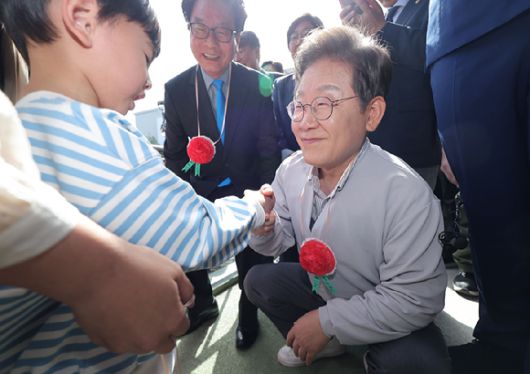 더불어민주당 이재명 대선 후보가 7일 전북 익산시 대한노인회 익산시지회에서 열린 노인회 간담회에 참석하던 중 어린이로부터 카네이션 목걸이를 받고 있다. 2025.5.7 [사진=연합뉴스]