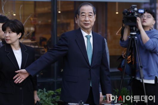 아시아투데이 박성일 기자 = 한덕수 무소속 대선 예비후보가 7일 서울 종로구의 한 식당에서 김문수 국민의힘 대선후보와 후보 단일화 관련 회동을 마친 후 식당을 나서고 있다. ⓒ "젊은 파워, 모바일 넘버원 아시아투데이"