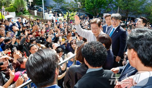 이재명 더불어민주당 대통령 후보가 2차 골목골목 경청투어 마지막 날인 7일 오후 전북 익산시 대한노인회 익산지회에서 간담회에 참석하기 전 시민들을 향해 인사하고 있다. 2025.5.7/뉴스1 ⓒ News1 안은나 기자 |