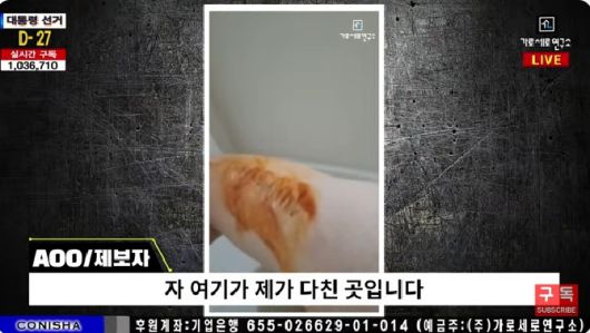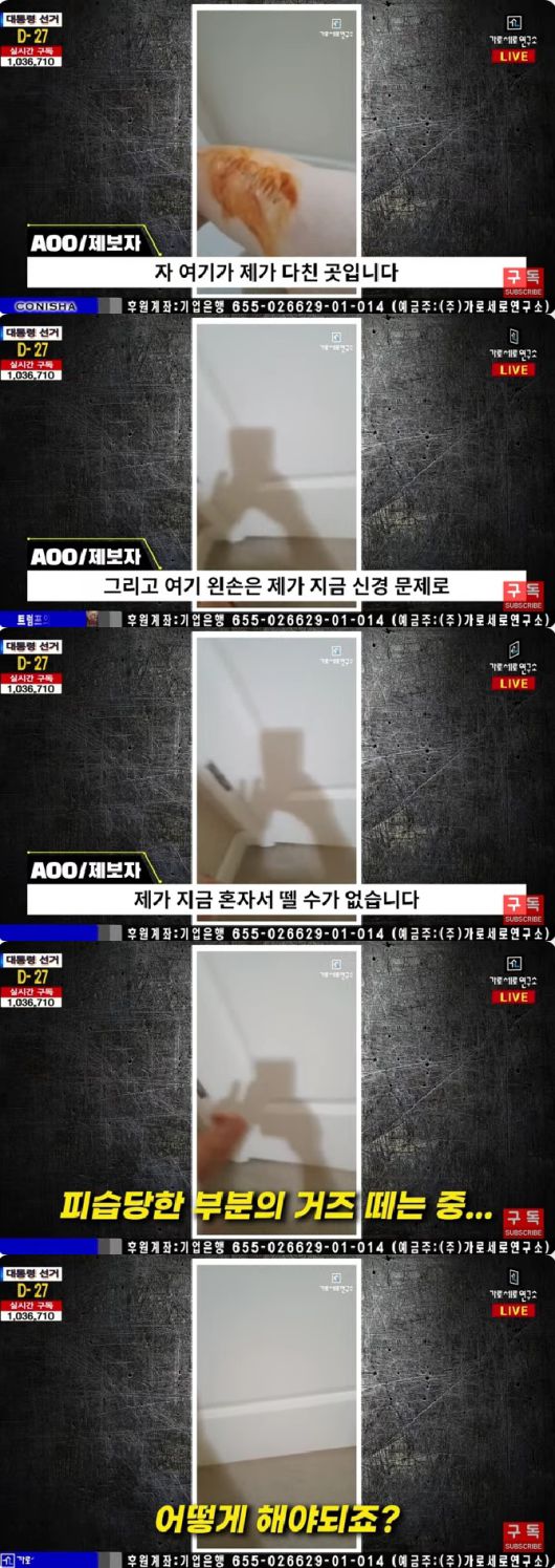 이어진 영상에서 제보자 A씨는 "왼손은 손을 쓸 수 없다. 오른쪽 어깨 쪽을 찍으려고 하면 손이 좀 떨린다. 이해해 주시고 사진을 찍어서 보내려고 했지만 개소리할까봐 아주 감사하다. 여기가 내가 다친 곳이다. 그리고 여기 왼손은 지금 신경 문제로 손가락에 감아져 있는 건 지금 혼자서 뗄 수 없다. 지혈이 안돼서 무슨 가루 같은 것도 넣고 이제 지혈이 좀 되고 있다"라고 말했다.