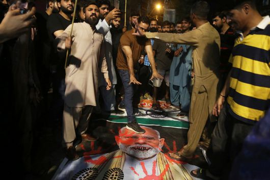 7일(현지 시간) 파키스탄 하이데라바드에서 인도의 미사일 공격에 분노한 시민들이 나렌드라 모디 인도 총리의 사진과 인도 국기를 발로 밟고 있다. 이날 인도가 파키스탄령 카슈미르 등에 미사일을 발사해 26명이 숨졌다. 파키스탄도 즉각 인도령 카슈미르 등에서 미사일 보복 공격에 나서 10명이 사망했다. 사실상 핵 보유국인 두 나라의 무력 충돌이 전면전 직전으로 치닫고 있다. 하이데라바드=AP 뉴시스 |