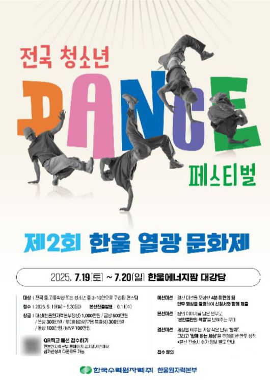 한국수력원자력 한울원자력본부는 제2회 한울 열광 문화제 '전국 청소년 댄스 페스티벌' 예선 동영상 접수를 오는 19~30일까지 진행한다고 7일 밝혔다.