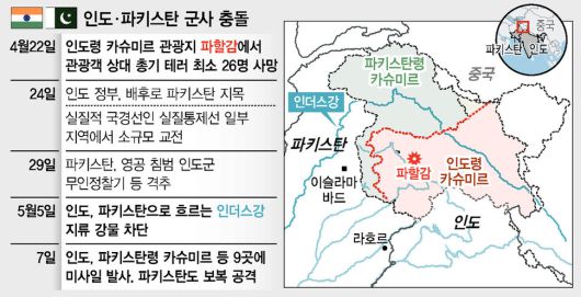 26명이 숨진 인도 카슈미르 관광객 테러 사건 이후 갈등을 빚어오던 인도와 파키스탄이 7일(현지시각) 미사일 공격을 주고받은 데 이어, 카슈미르를 가로지르는 실질적 국경선인 ‘실질 통제선’(Line of Control) 일대에서 격렬한 포격전을 벌였다. 이로 인해 최소 36명이 사망하는 등, 2003년 양국 휴전 협정 이후 심각한 규모의 무력 충돌이 빚어졌다고 로이터 통신 등이 전했다. 두 나라 모두 핵무기 보유국이어서, 전면전으로 확대될 가능성을 셈하며 국제사회가 긴장하고 있다.