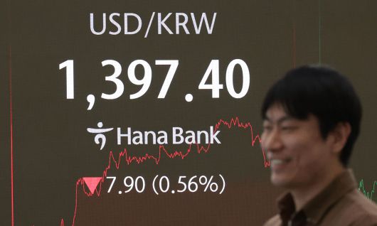 7일 서울 중구 하나은행 딜링룸 현황판에 원/달러 환율 지수 등이 표시되고 있다. 이날 코스피 지수는 전 거래일 대비 14.01포인트(0.55%) 오른 2,573.80에, 코스닥은 0.95포인트(0.13%) 오른 722.81에 장을 마감했다. 원/달러 환율 주간 거래 종가는 전날보다 7.3원 내린 1,398.0원에 거래를 마쳤다. 연합뉴스 |