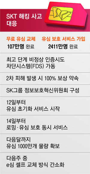 상대적으로 유심 교체는 더디다. 현재까지 107만명만 이뤄졌다. SK텔레콤은 이달 중순에 유심 물량이 본격적으로 확보돼 교체 속도도 빨라질 것으로 내다봤다. 임봉호 SK텔레콤 이동통신(MNO)사업부장(부사장)은 “다음주부터는 순차적으로 유심 물량이 풀려 교체에 속도를 낼 수 있을 것”이라고 말했다. SK텔레콤은 이 밖에 오는 10일부터 유심 포맷(초기화) 서비스를 시작하고 조만간 e심 셀프 교체 방식을 간소화하는 등 추가 대응책을 내놓을 예정이다.