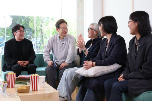 이 후보는 이날 전북 전주 한옥마을 한 카페에서 문화예술 분야 관계자들과 함께 ‘K콘텐츠 산업 진흥 간담회’를 했다. 간담회에는 영화 <국제시장> <해운대>를 연출한 윤제균 감독과 영화 <다음 소희>의 정주리 감독, 드라마 <더 글로리> <도깨비>를 집필한 김은숙 작가와 <나의 아저씨> <나의 해방일지>의 박해영 작가 등이 참석했다.