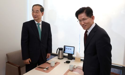 국민의힘 김문수 대선후보(오른쪽)와 무소속 한덕수 대선 예비후보가 7일 서울 종로구의 한 식당에서 후보 단일화 관련 회동을 하고 있다. 연합뉴스 |