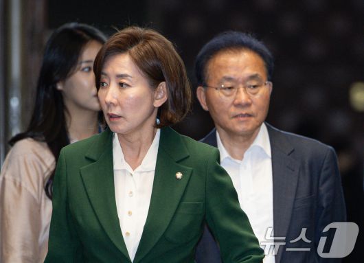 (서울=뉴스1) 이재명 기자 = 국민의힘 나경원, 윤재옥 의원이 7일 오후 서울 여의도 국회에서 열린 의원총회에 참석하고 있다. 2025.5.7/뉴스12expulsion@news1.krCopyright ⓒ 뉴스1. All rights reserved. 무단 전재 및 재배포, AI학습 이용 금지.