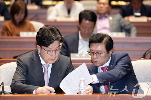 (서울=뉴스1) 이재명 기자 = 권성동 국민의힘 원내대표와 박형수 원내수석부대표가 7일 오후 서울 여의도 국회에서 열린 의원총회에서 대화를 하고 있다. 2025.5.7/뉴스1
