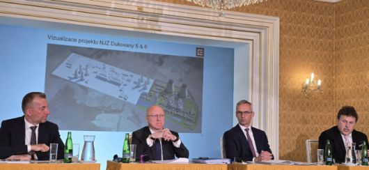 기자회견하는 체코전력공사 관계자들. 왼쪽부터 파벨 시라니 CEZ 이사회 부의장, 다니엘 베네쉬 CEZ 그룹 CEO, 토마시 플레스카치 CEZ 신사업 본부장, 페테르 자보드스키(Petr Zavodsky) EDU II CEO. 산업부 제공 |