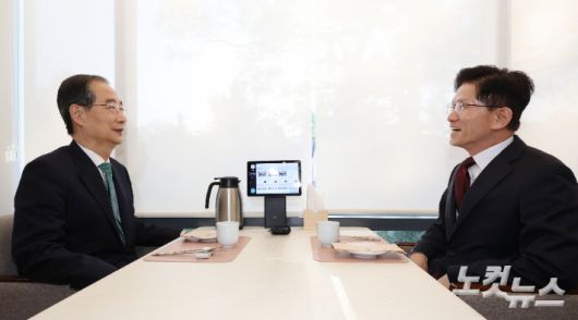 국민의힘 김문수 대선후보와 무소속 한덕수 대선 예비후보가 7일 서울 종로구의 한 식당에서 후보 단일화와 관련해 회동하고 있다. 류영주 기자 |