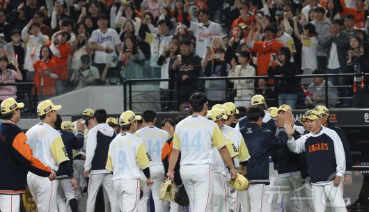 (대전=뉴스1) 김기남 기자 = 7일 대전 한화생명볼파크에서 열린 '2025 신한 SOL 뱅크 KBO리그' 프로야구 한화 이글스와 삼성라이온즈 경기에서 한화가 10대6 승리하며 선수들이 김경문 감독과 하이파이브를 하고 있다. 2025.5.7/뉴스1kinam@news1.krCopyright ⓒ 뉴스1. All rights reserved. 무단 전재 및 재배포, AI학습 이용 금지.