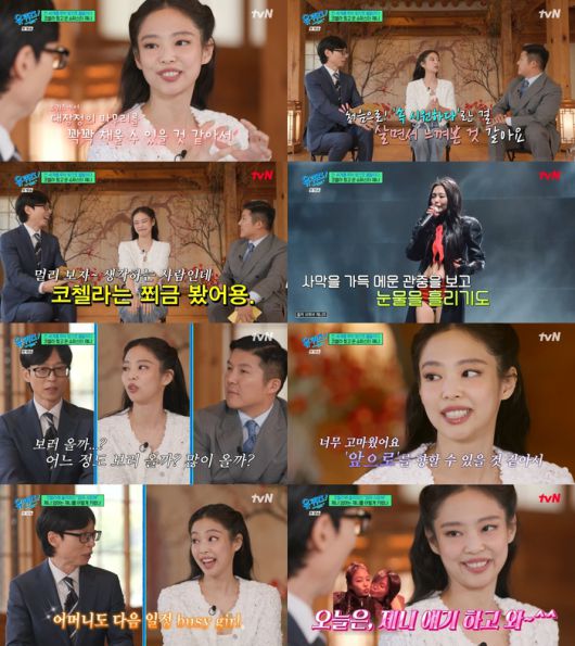 유재석은 “본인은 코첼라 영상 몇 번이나 봤냐”고 물었다. 제니는 “솔직하게 풀로 한두 번 정도 봤다. 그다음에 핸드폰 보는데 뜨더라. 계속 들어가게 되더라”라고 너스레를 떨었다. 이어 “원래는 모니터링을 거의 안 한다. 생각이 많은 편이어서 모니터링을 하다 보면 작은 디테일에 꽂힐 거 같아 ‘멀리 보자’라는 생각으로 사는 사람인데 코첼라는 조금 봤다. 완벽해서라기보다 너무 진심으로 했던 내 모습이어서. 부끄럽지만”이라고 자랑했다.