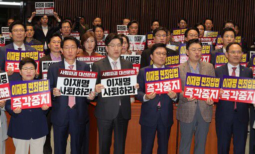 국민의힘 권성동 원내대표(왼쪽 세 번째)를 비롯한 의원들이 7일 서울 여의도 국회에서 열린 의원총회에서 형사소송법 개정안과 공직선거법 개정안 강행 처리를 규탄하고 있다. 왼쪽부터 임이자 의원, 김상훈 정책위의장, 권 원내대표, 박형수·김성원·임종득 의원. 이재문 기자 ⓒ 세상을 보는 눈, 세계일보