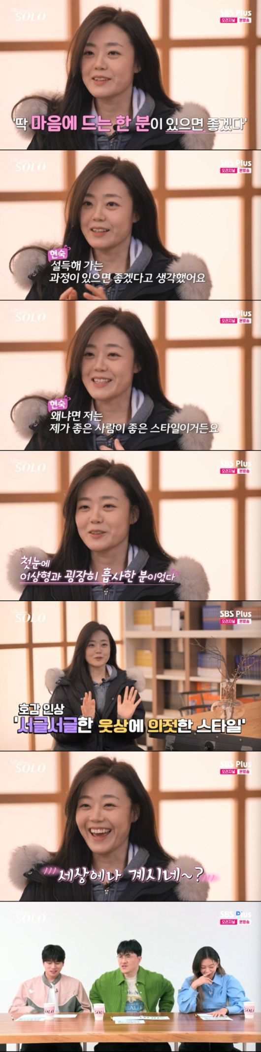 현숙은 "기대했던 건 마음에 드는 한분이 있으면 좋겠다. 그분이 설사 날 마음에 들어하지 않더라도 내다 좀 마음껏 그분을 좋아하고 설득해 가는 과정이 있으면 좋겠다고 생각했다. 난 내가 좋은 사람이 좋은 스타일이다. 사실 멋있다. 어떤 분이 특히 멋있다"라고 말해 MC들의 궁금증을 자아냈다.