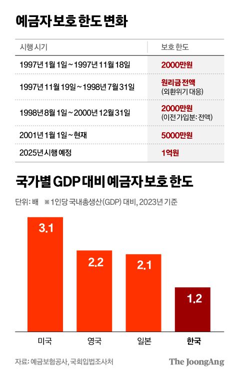 예금자 보호 한도는 2001년 5000만원으로 지정된 이후 24년 만에 2배로 늘게 됐다. 2023년 1인당 국내총생산(GDP) 대비 예금 보호 한도는 미국(3.1배), 영국(2.2배), 일본(2.1배)보다 낮은 1.2배에 불과했다. 이번 상향으로 일본(1000만 엔·9800만원) 등 주요 선진국 수준으로 오르게 된다.