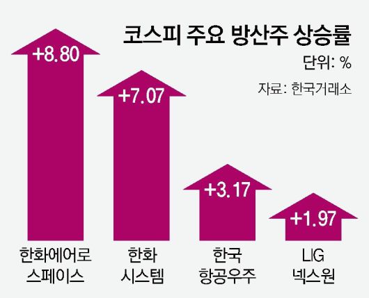 소폭이지만 상승 마감에 기여한 것은 방산 업종이었다. 한화에어로스페이스(+8.80%), 한화시스템(+7.07%), 한국항공우주(+3.17%) 등 주요 방산 기업들의 주가가 큰 폭으로 올랐다. 인도와 파키스탄의 무력 충돌로 지정학적 위험이 고조되면서 ‘K-방산’이 수혜를 볼 수 있다는 관측 때문으로 풀이된다. 7일(현지 시간) 인도와 파키스탄은 서로 미사일 및 보복 공격 등을 실시하며 6년 만에 군사적으로 충돌했다. 특히 이날 한화에어로스페이스는 역대 최고치인 89만 원을 기록하면서 현대차를 제치고 코스피 시가총액 5위 종목으로 등극했다.