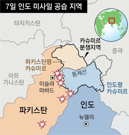 지난달 22일(현지 시간) 인도령 카슈미르에서 발생한 총기 테러를 계기로 국경지대에서 소규모 교전을 벌여 온 인도와 파키스탄이 7일 미사일 공격을 주고받아 한국 시간 오후 8시 기준 130명(사망자 36명, 부상자 94명)의 사상자가 발생했다. 양국이 영유권 분쟁지역인 카슈미르에서 대규모 무력 충돌에 들어간 건 6년 만이다. 테러 발생 뒤 물 공급 중단, 핵공격 위협 등으로 높아진 양국 간 갈등 수위가 전면전 직전으로 치닫고 있는 것. 사실상 핵보유국인 두 나라의 무력 충돌에 국제사회의 우려도 커지고 있다.