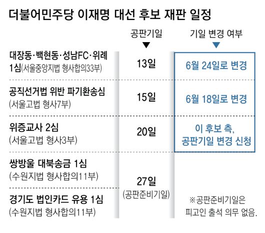 이 후보 측은 13일과 20일 각각 공판이 예정된 대장동·백현동·성남FC·위례 사건 1심 재판부와 위증교사 사건 2심 재판부에도 공판기일 변경신청서를 냈고, 대장동 등 사건을 심리하는 서울중앙지법 형사합의33부(부장판사 이진관)도 다음 달 24일로 재판을 연기했다. 이 후보가 1심에서 무죄를 선고받은 위증교사 재판도 연기될 가능성이 작지 않다.