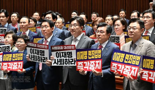 국회 정무위원회·기획재정위원회 소속 민주당 의원들이 이날 서울고등법원 앞에서 이재명 민주당 대선 후보의 공직선거법 위반 사건에 대한 파기환송을 규탄하는 기자회견을 하고 있다. 뉴스1 |