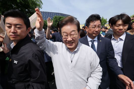 더불어민주당 이재명 대선 후보가 '골목골목 경청투어:국토종주편'에 나선 7일 전북 전주시 풍남문 앞 광장에서 지지자 및 시민들에게 인사를 하고 있다. 연합뉴스 |