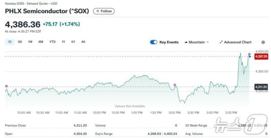 7일(현지시간) 뉴욕증시에서 반도체지수는 1.74% 상승한 4386.36포인트를 기록했다.