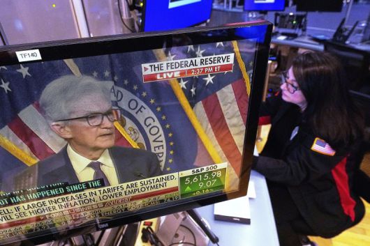 미국 뉴욕 뉴욕증권거래소(NYSE) 모니터에 7일(현지시간) 제롬 파월 연방준비제도(연준) 의장의 기자회견 방송이 나오고 있다. 뉴욕 증시는 파월 의장이 추가 금리 인하에 신중한 입장을 나타냈지만 사흘 만에 반등에 성공했다. AP 뉴시스 |
