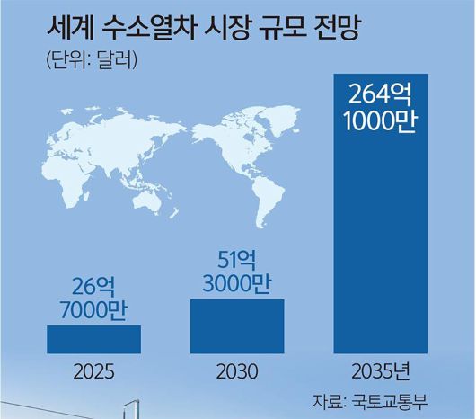 이런 장점을 바탕으로 수소열차는 전 세계에서 차세대 대중교통수단으로 주목받고 있다. 국토부에 따르면 세계 수소열차 시장은 연평균 25.8% 성장해 올해 26억7000만달러(약 3조8000억원)에서 2035년 264억달러(약 37조6000억원) 규모에 이를 것으로 전망된다.