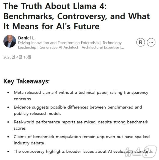 다니엘 엘(Daniel L)이라는 인물이 올린 라마 4의 진실:벤치마크, 논란, AI의 미래에 미치는 영향(링크드인 게시글 갈무리)