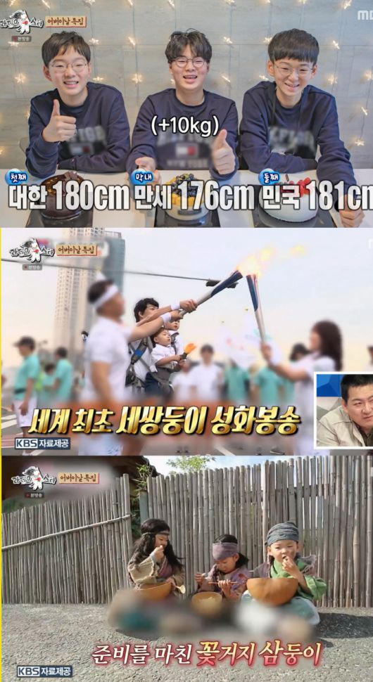 그는 과거 삼둥이와 세계 최초 성화봉송, 철인 3종경기에 함께 참여한 영상, 드라마 '장영실'에 삼둥이들이 꼬마 거지로 등장해 배우로 데뷔한 화면 등을 다시 보며 눈가가 촉촉해졌다.