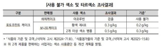 또 다른 포토프린트 케이크 1개 제품은 타르색소 함량이 사용기준을 초과한 것으로 드러났다. 이들 두 제품의 제조업체는 문제 색소 사용을 중단하겠다는 개선 계획을 발표했다.