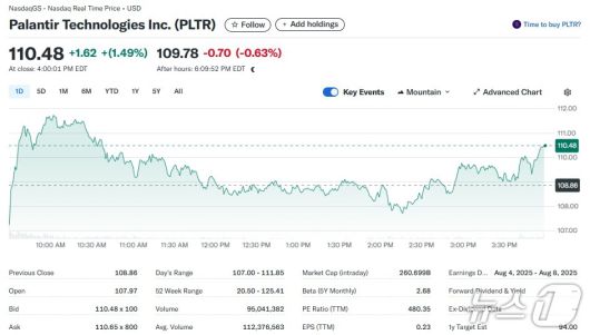 7일(현지시간) 뉴욕증시에서 팔란티어는 1.49% 상승한 110.48달러를 기록했다.