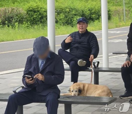 윤석열 전 대통령이 지난 5일 반려견, 경호원 3명과 함께 동작대교 부근 한강을 산책하다 잠시 쉬고 있는 모습이 누리꾼에 의해 포착됐다. ((온라인 커뮤니티 '클리앙' 갈무리)ⓒ 뉴스1 |