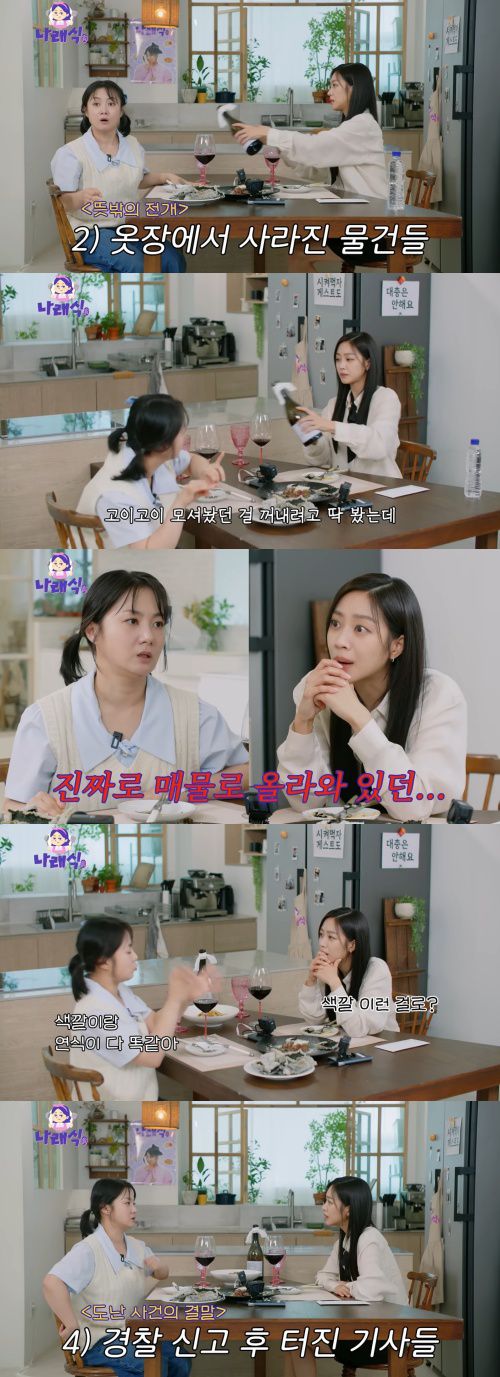 박나래는 절도 사건이 발생한 상황에 대해 "김지민 언니가 결혼을 앞두고 동기들과 웨딩 촬영을 하자고 해서 가장 비싼 가방을 꺼내려고 했다. 결혼식과 동창회가 여자들이 가장 꾸미고 싶은 날 아니냐"며 “집 안 깊숙이 고이 보관해 둔 명품 가방을 꺼내려던 순간, 그 가방이 사라진 걸 알게 됐다”고 회상했다. 그는 “그때부터 멘탈이 완전히 무너졌다”며 당시의 충격을 고스란히 전했다.