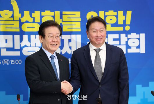 지난해 9월5일 이재명 더불어민주당 대선 후보(왼쪽)가 당대표로 최태원 대한상공회의소 회장과 국회에서 만나 악수하고 있다. 박민규 선임기자 |