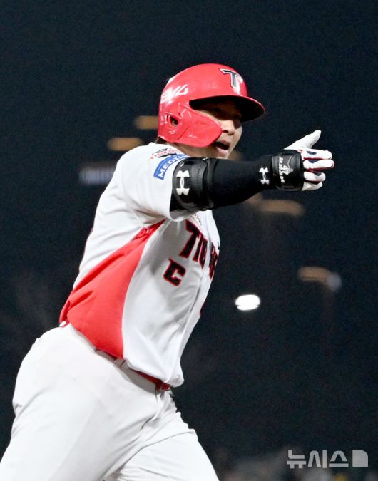 [광주=뉴시스] 김혜인 기자 = 25일 오후 광주 북구 기아챔피언스필드에서 열린 2025 프로야구 KIA타이거즈와 키움 히어로즈의 경기, KIA 나성범이 3회 말 연타석 홈런을 친 뒤 세리머니하고 있다. 2025.03.25. hyein0342@newsis.com |