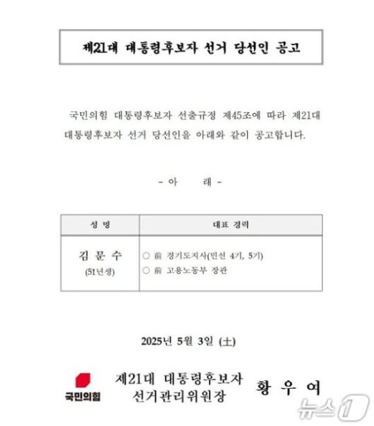 김문수 국민의힘 대선후보가 7일 밤 11시 47분 SNS에 대선후보 당선 공고문을 띄워 그 배경에 비상한 관심이 쏠렸다. (SNS 갈무리) ⓒ 뉴스1 |