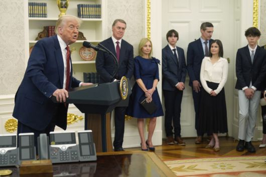 도널드 트럼프 미국 대통령이 7일(현지시간) 백악관 오벌 오피스(집무실)에서 진행된 데이비드 퍼듀 주중 미국대사(왼쪽 두번째) 선서식 이후 기자들의 질문에 답하고 있다./AP·연합 |