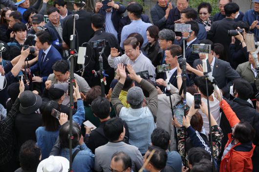 더불어민주당 이재명 대선 후보가 7일 전북 익산시 대한노인회 익산시지회에서 열린 노인회 간담회에 참석하며 지지자 및 시민들에게 인사를 하고 있다. 연합뉴스 |